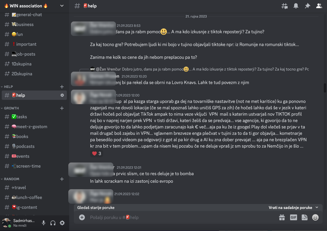 V zaprtem Discordovem kanalu člani izmenjujejo vse od aktualnih informacij, relevantnih knjig/dogodkov, pa do priložnosti za zaposlitev. Imamo tudi poseben #channel, kjer naši člani objavijo, ko potrebujejo pomoč ali nasvet.